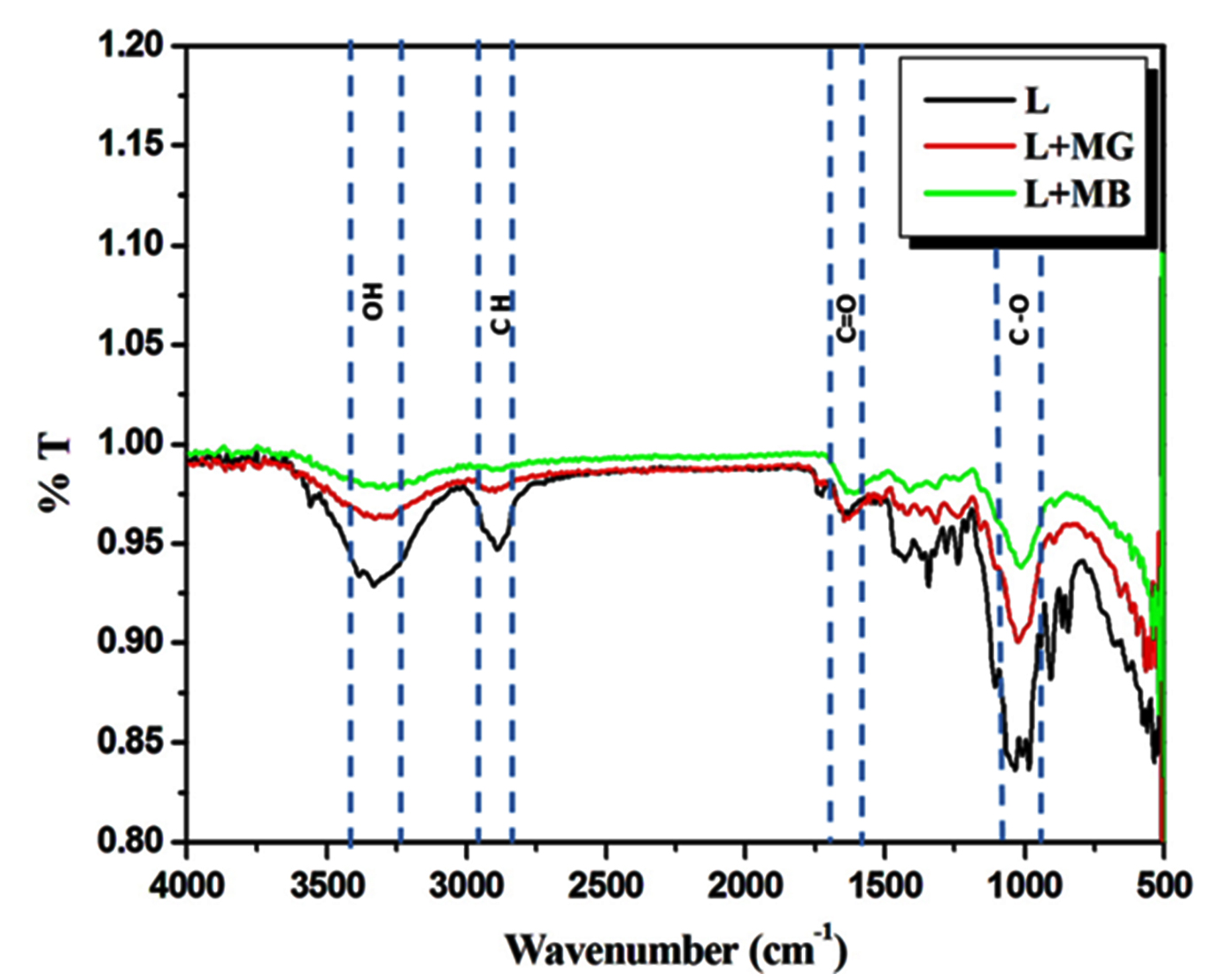 FTIR spectroscopy suggested the presence of functional groups involved in LS-dye interactions. Following the adsorption of MG and MB dyes on LS, the dried and powdered LS were subjected to FTIR analysis (Figure 7). The visible spectra peak at 3,330 cm-1 is associated with the stretching of hydroxyl (OH) groups that exist in the cellulose structure of the material. The peaks found within the range of 1650-1735 cm-1 and 1100-1373 cm-1 was attributed to the C=O stretching vibration of the carbonyl group and the C-O stretching vibration of the acetyl groups, respectively. The bond observed at 2,800 cm-1 is associated with the aliphatic C–H group found in the alkyl group. After adsorption, changes in the peak intensity of LS denote the role of respective groups (O-H, C-H and C-O bonds) in the adsorption process of MG and MB dye onto LS. Similar microscopic features of the cellulosic polysaccharide were observed for absorption of MB and MG dyes while immobilizing Gluconacetobacter kombuchae on Luffa aegyptica support for bacterial cellulose production.48,49