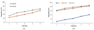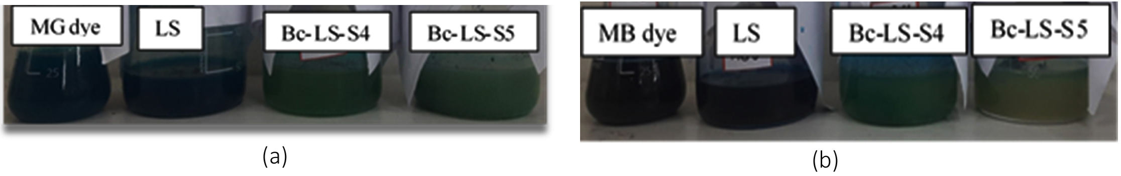 After the successful immobilization process, the dye degradation experiments were set up based on 37 °C temperature where the S4 and S5 showed highest dye degradation properties, otherwise temperature had no influence separately on LS adsorption. The pH was also considered between 7.5-8.5, as the best dye degradation was exhibited by S4 and S5 and good adsorption by LS in these ranges. The MG and MB dye concentration chosen was 0.05% in this study. Initially the bacteria were grown to lag phase prior to immobilization as the larger inoculum size with active seed culture minimizes the length of adaptation (lag period) phase and facilitates the biomass concentration within a short time leading. Figure 8 (a,b) displays the experimental set up of dye degradation and adsorption by S4 and S5 bacteria after 5 hours.