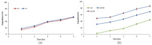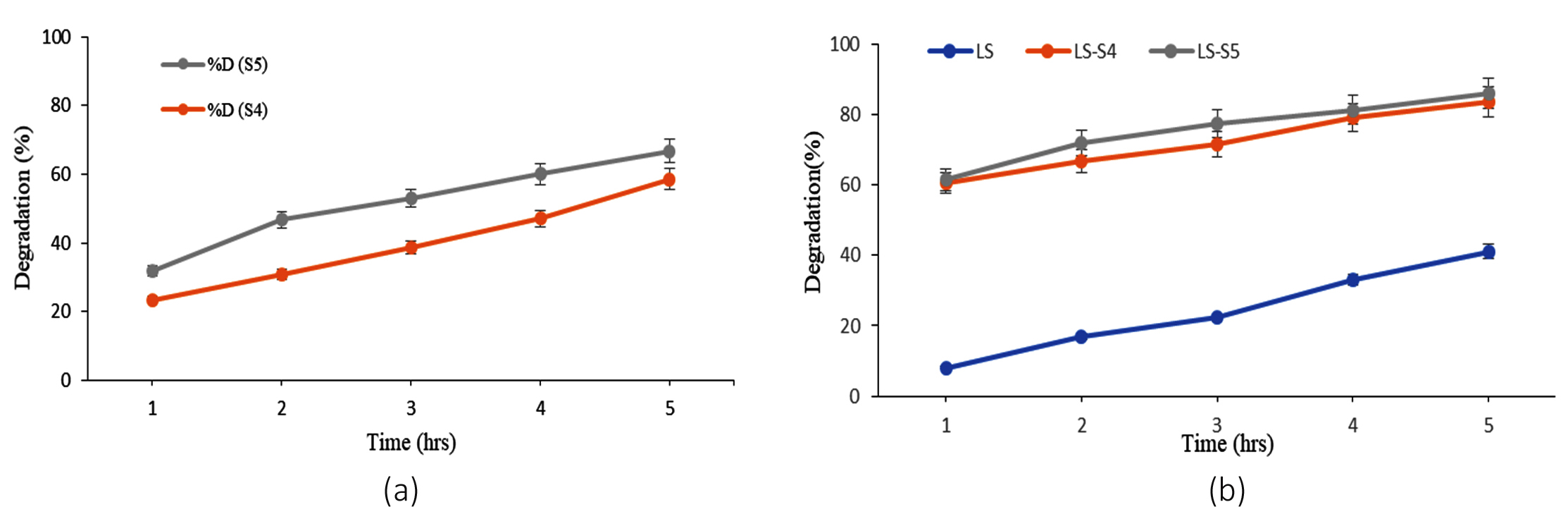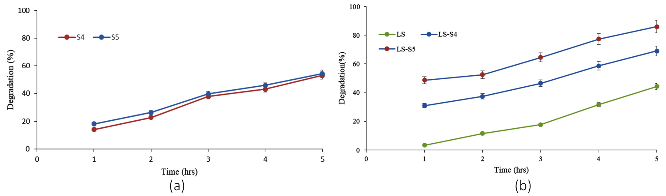 Figure 10. Demonstrates comparison between MG degradation capabilities of (a) individual bacteria S4 and S5 with (b) LS alone and bacteria immobilized LS (LS-S4 and LS-S5)