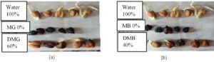 Effect of raw dye and microbial treated dye on germination and growth of Cicer seedlings were observed. Seed germination showed a variance of 60% with DMG (degraded malachite green) and 40% growth with DMB (degraded methylene blue) compared to 100% germination in water whereas no seed germination was observed with the raw dyes (Figure 11). In the pot treated with the DMG solution, healthy plant growth was observed, with an average root length of 10 cm and shoot length of 22 cm after 12 days growth period. In contrast, seeds irrigated with the raw MG solution showed stunted growth, with an average root length of 5.5 cm and shoot length of 10 cm (Figure 12a, b).