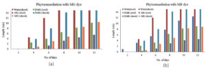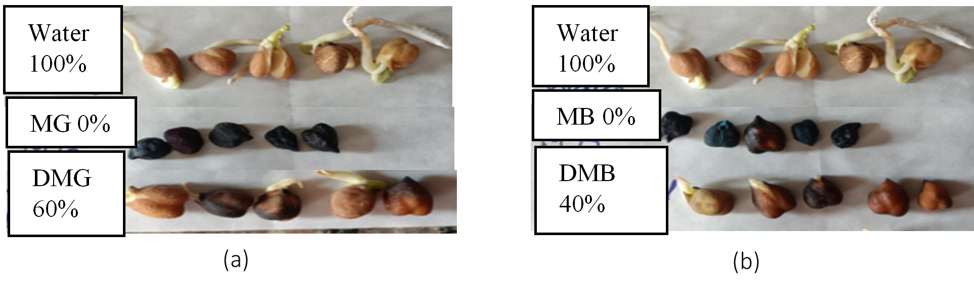 The Phytotoxicity assay, a part of ecotoxicological assessment was performed with the raw dyes (MG and MB) and degraded form of the dye on Cicer seeds (Bengal gram). Seed germination rate, plumule, and radicle lengths were measured post-treatment with dyes and its degraded form along with water as control. For the study, healthy seeds were chosen, surface sterilized with HgCl2 and again washed with distilled water. The seeds after treatment with raw dye and its degraded products were placed between wet tissue papers and allowed to germinate at room temperature. Control set was kept using tap water of the same volume at the same time. Thereafter all the parameters were recorded till 12 days’ time. The seed germination (%) formulae for phytotoxicity assay calculated is: