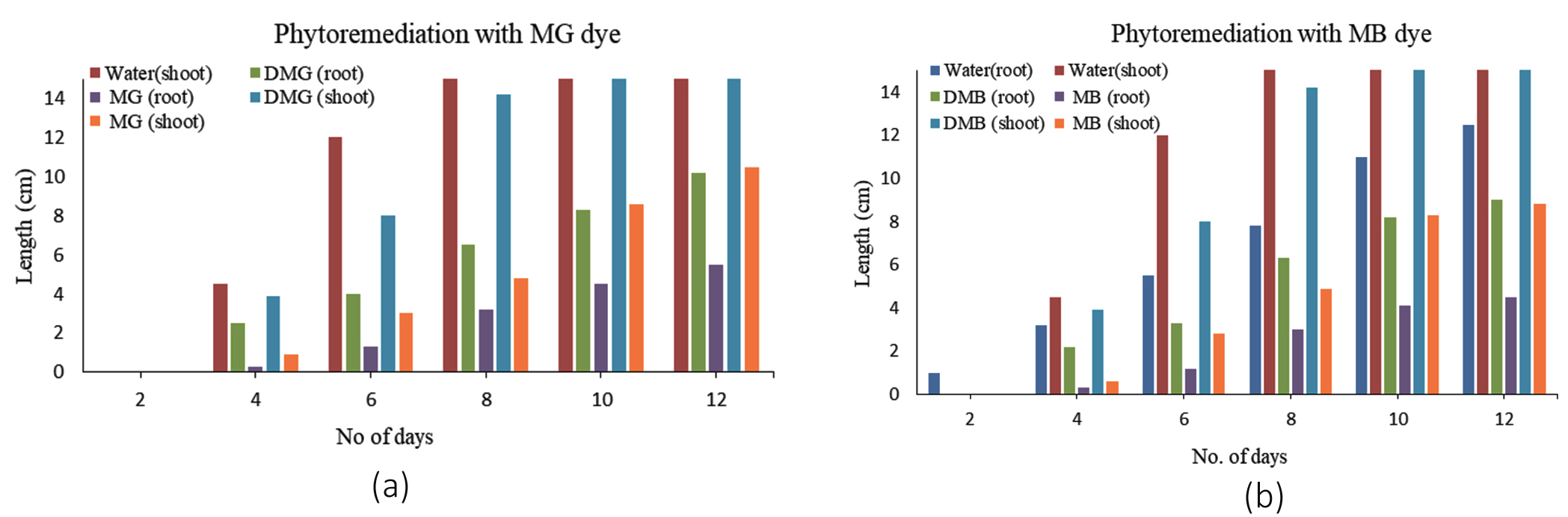 Figure 12. Comparison of root and shoot length of germinated Cicer seeds when treated with (a) MG dye and degraded MG, (b) MB dye and degraded MB