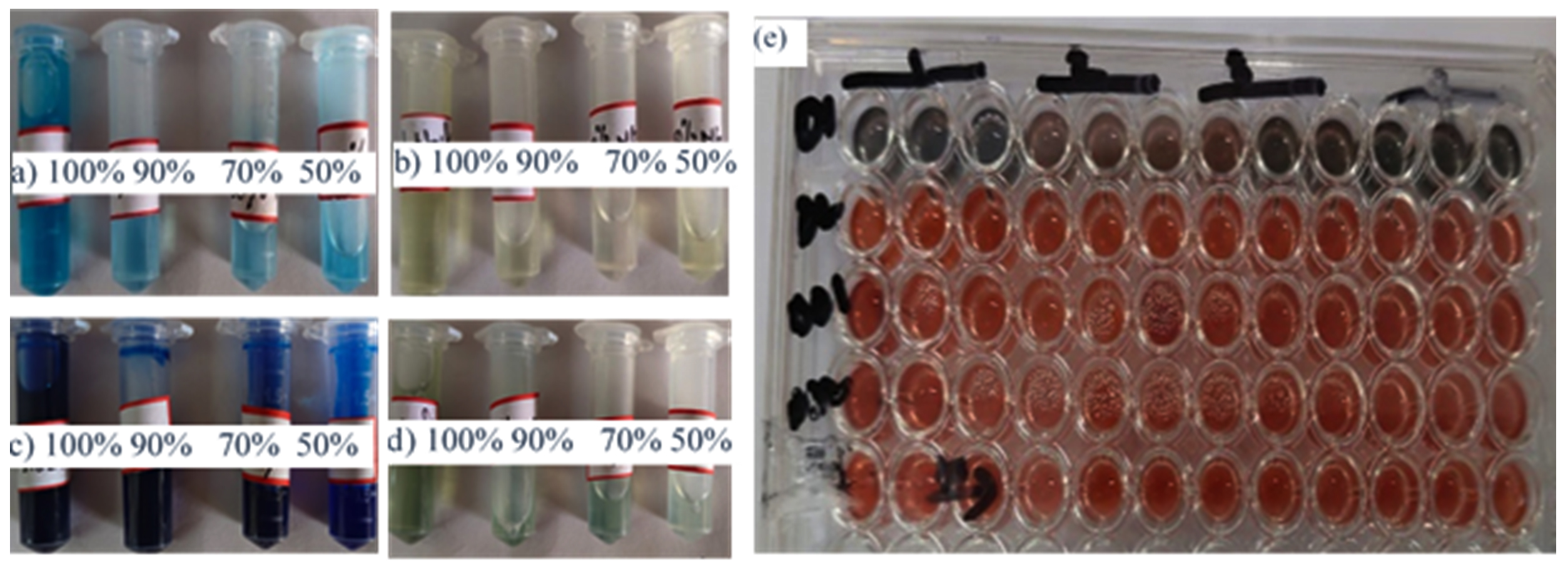 Figure 13. Cytotoxicity test on WBCs. a) Different concentration of MG and (b) its degraded concentration, c) Different concentration of MB and (d) its degraded concentrations, (e) 96 well LDH assay plate with MB, MG, DMB and DMG in consecutive rows. Each dye concentration were examined in triplicate and the average plotted in LDH assay graph