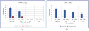 LDH, a soluble cytoplasmic enzyme found in most cells including blood, is released extracellularly upon damage to plasma membrane. The released LDH is detected by tetrazolium salt in presence of NADH which is formed when LDH oxidizes lactate to pyruvate. A colored product (formazan) is formed which is detected by standard spectroscopic techniques. In the LDH assay graph, the results imply that raw MG and MB are cytotoxic to some extents to the white WBCs, however it is pretty minimal (25% for MB and 9.5% for MG). In contrast, degraded MG (DMG) and degraded MB (DMB) has far lower cytotoxicity (~1%), even at full strength (Figures 13a, b and 14a, b).