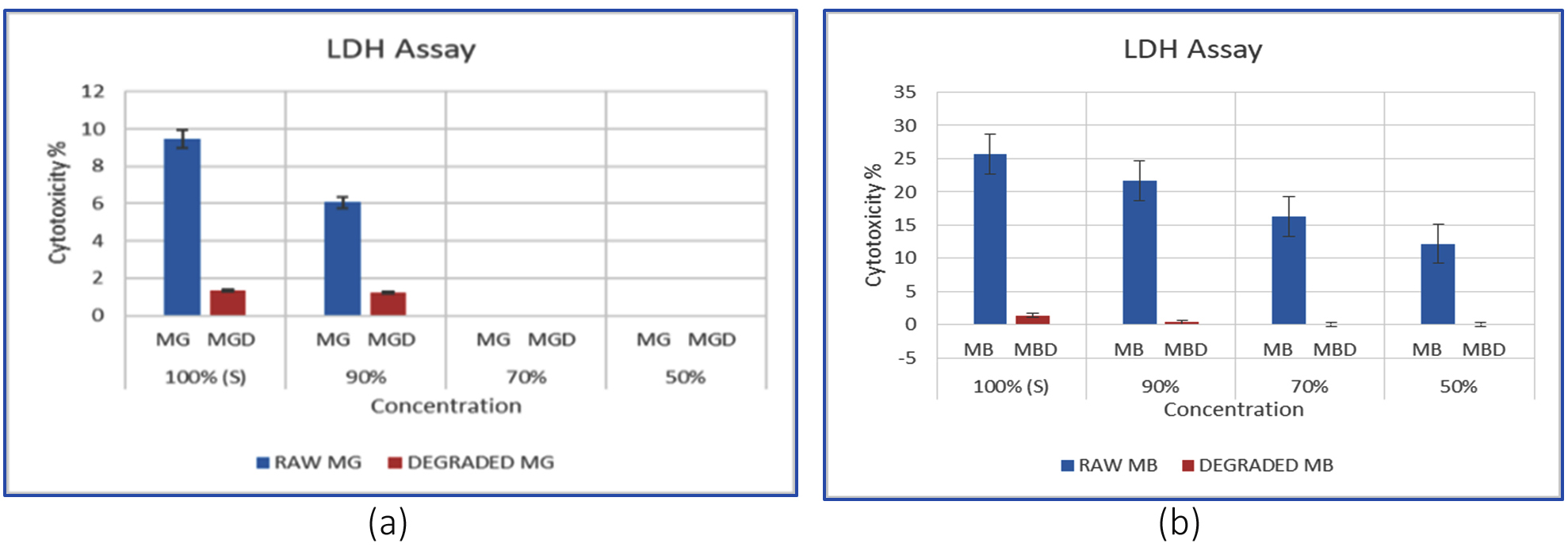 Lactate Dehydrogenase Activity (LDH release assay) was performed to assess the degree of cytotoxicity of the raw vs. degraded form of the dyes at defined concentrations. Cells release LDH after death into the medium; the released LDH reduces NAD to NADH, which is specifically detected colorimetrically at 450 nm through microplate reader. Peripheral blood mononuclear cells isolated from healthy donors by Ficoll density gradient centrifugation, were treated with intact and degraded form of the MB and MG dye at defined concentrations in a 96 well plate (1 x 106 cells/ well). Each concentration was plated in triplicate. Positive control (PBMCs treated with 10% Triton X-100) and negative control (untreated PBMCs) were plated alongside the test samples in triplicates. The plate was incubated for 24 hours at 37 °C with 5% CO2 in cell culture incubator. Thereafter the cytotoxicity was assessed by measuring the release of LDH is cell free supernatants and the cytotoxicity (%) was calculated by the formula-