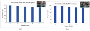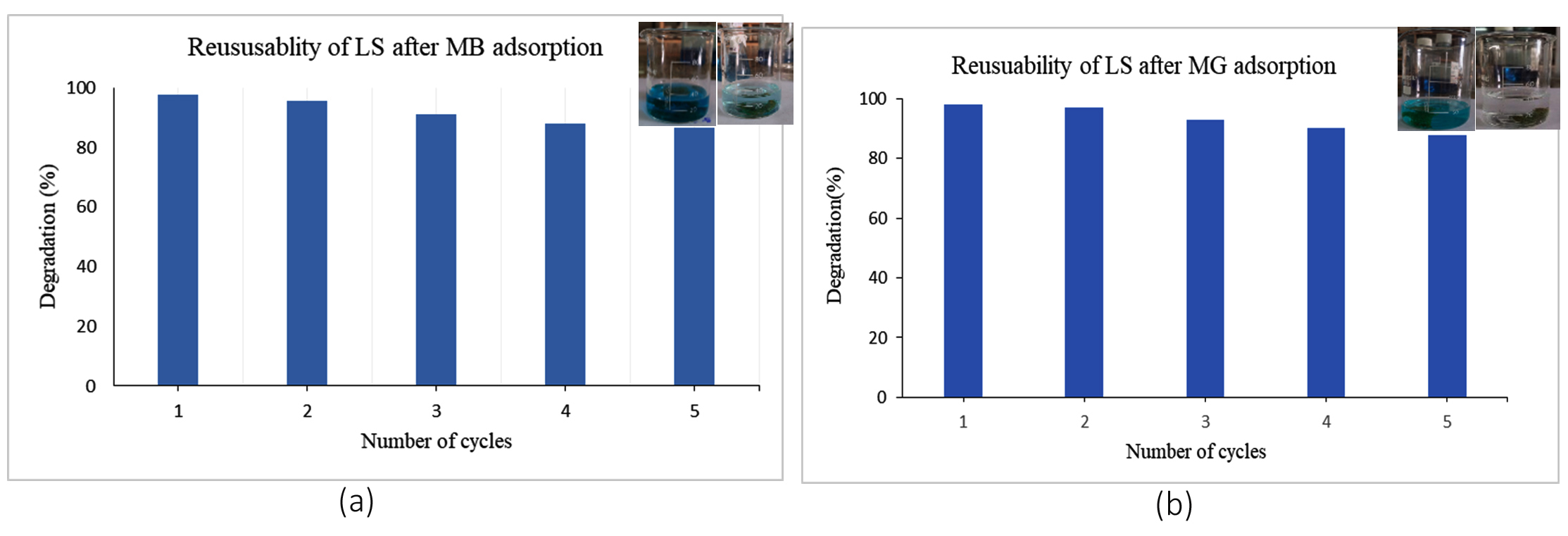 Post-dye adsorption, the LS pieces were regenerated for further dye removal studies. For dye desorption, LS pieces were soaked in acidic (H2SO4) and organic solvent (ethanol) for 1 hour under shaking condition. Then they were washed thoroughly with distilled water and air-dried at room temperature. The desorbed LS were re-used in fresh MB and MG dye solutions for further dye adsorption under same conditions. Number of adsorption-desorption cycles was repeated 5 times and dye removal efficiency was measured after each cycle.
