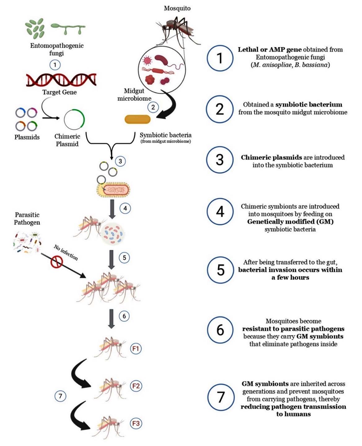 Figure 1. This schematic illustrates the workflow for developing genetically modified (GM) symbionts for mosquito vector control. Antimicrobial or lethal genes are selected from EPF and inserted into plasmids, which are introduced into symbiotic bacteria isolated from the mosquito midgut. These chimeric symbionts are reintroduced into mosquitoes through feeding, colonize the gut within hours, and inhibit pathogen development. Over successive generations (F1-F3), GM symbionts are vertically transmitted, maintaining pathogen resistance and reducing disease transmission potential