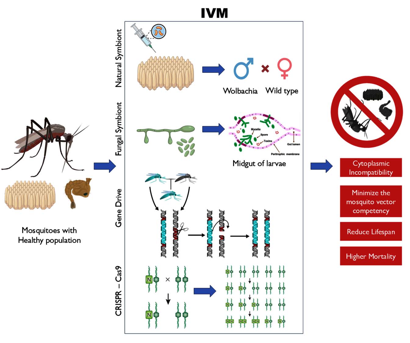 Sustainable mosquito management requires a shift from single-method to integrated strategies. EPF, gene drives, and symbiont-based methods are complementary tools with unique strengths that can overcome the limitations of insecticide-based management strategies. EPF, such as M. anisopliae and B. bassiana, provide rapid population suppression through direct infection and pathogenicity. Moreover, recent advances have enabled the engineering of fungal strains capable of expressing antiparasitic effectors that target malaria parasites within mosquitoes.82 Gene drive systems, particularly CRISPR-based drives targeting fertility or pathogen transmission, offer long-term suppression or modification; however, they face resistance evolution and regulatory concerns.83,84 Wolbachia spreads through populations by inducing cytoplasmic incompatibility, a reproductive mechanism that prevents uninfected females from producing viable offspring with infected males, thereby favouring the spread of infection.85,86