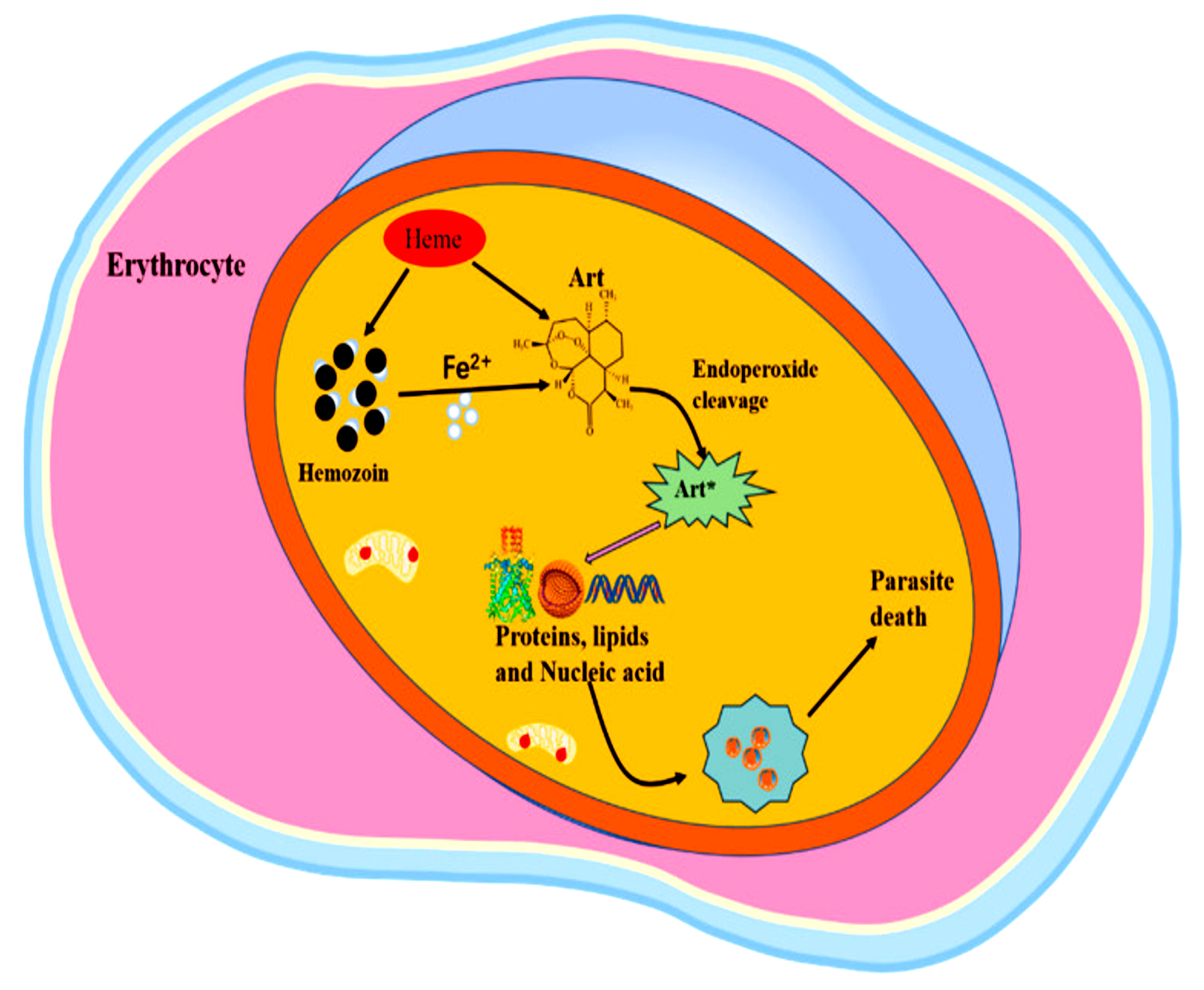 The mode of action of artemisinin against Plasmodium falciparum involves the destruction of proteins by carbon-centered radicals released upon activation of the drug. Artemisinin produces reactive oxygen species (ROS) when ferrous iron (Fe2+) is activated during hemoglobin digestion, as shown in Figure 2. This activation results in the development of alkylating agents that disrupt vital biomolecules, lipids, and proteins, damaging cellular roles and causing the death of parasites.42 This action radically differs from Other antimalarial medications, which usually target one enzyme or pathway.
