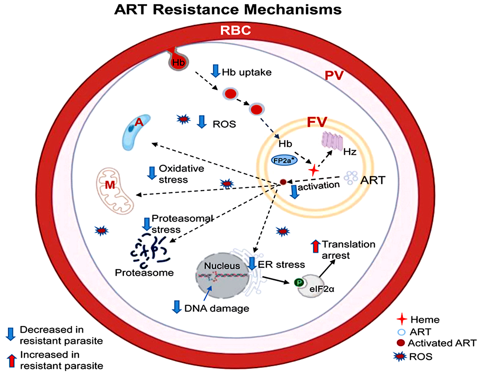 One vital component of antimalarial therapies is artemisinin, which is particularly effective against Plasmodium falciparum, the deadliest malaria parasite species.48 However, artemisinin resistance has emerged, primarily in Southeast Asia and, more recently, in Africa,49 emphasizing the demand for a deeper understanding of the underlying mechanisms. This complex resistance involves mutations in key genes, cellular stress response alterations, and hemoglobin uptake modification as shown in Figure 3.50