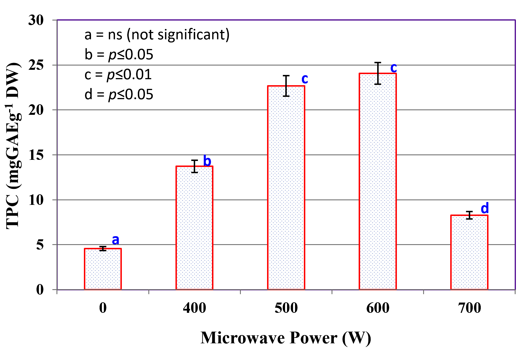 MAPT was employed to prepare hydrolysate from DB of C. humicola MCH4 for subsequent extraction of TPC. The pre-treatment was carried out using a domestic microwave oven (Model: IFB 17PM-MEC1, 17L Solo Microwave Oven, IFB Industries Ltd., India). For each experiment, 25 g of DB was mixed in 100 mL of deionized water and then exposed to microwave irradiation at varying power levels ranging from 400 W to 700 W, with 100 W increments. The treatment was conducted for 5 minutes at a temperature of 80 °C for 400-600 W and 120 °C for ≥700 W. Following MAPT, the samples were cooled at ambient temperature and estimated TPC. A non-treated biomass hydrolysate served as the control. The condition that resulted in the maximum TPC harvest was identified and chose as the optimal microwave setting for hydrolysate preparation from DB of C. humicola MCH4 using MAPT.