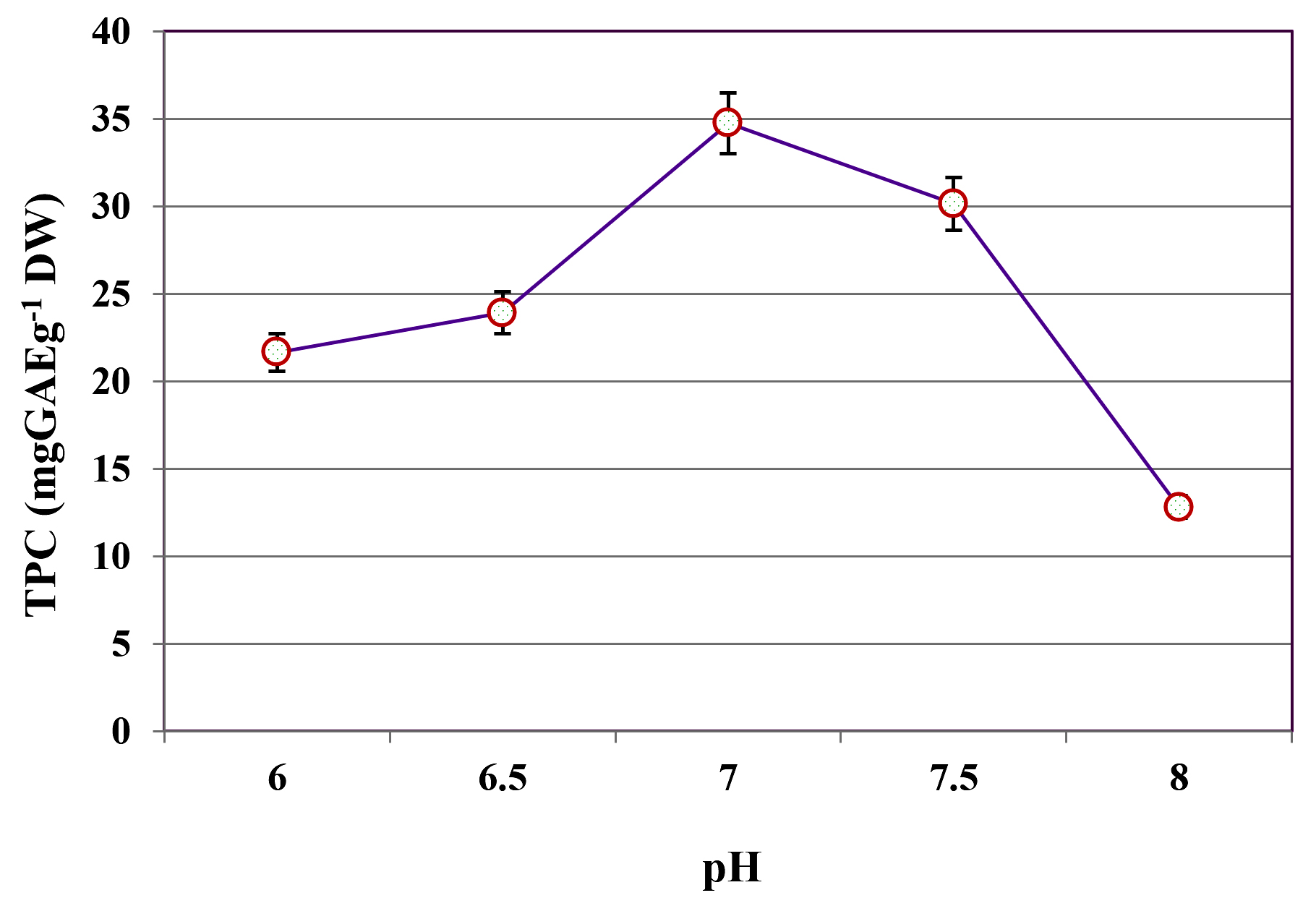 The influence of different pH levels (6.0-8.0) on the extraction of TPC from C. humicola MCH4 hydrolysate, prepared using MAPT at 600 W and fermented by B. subtilis under SmF, was evaluated (Figure 2). TPC yield was lowest at pH 6.0, with a value of 21.65 ± 0.12 mg GAE g-1 DW. A gradual increase in TPC yield was observed with rising pH, reaching a maximum of 34.76 ± 0.22 mg GAE g-1 DW at pH 7.0. Further elevation of pH beyond this optimum resulted in decreased phenolic content: 30.15 ± 0.09 mg GAE g-1 DW at pH 7.5 and 12.82 ± 0.14 mg GAE g-1 DW at pH 8.0. The one-way ANOVA showed a statistically significant difference in TPC among the different pH levels (p ≤ 0.05). This indicates that pH has a significant effect on extraction of TPC. The highest TPC was observed at pH 7, hence it was used as an optimal pH for further study.