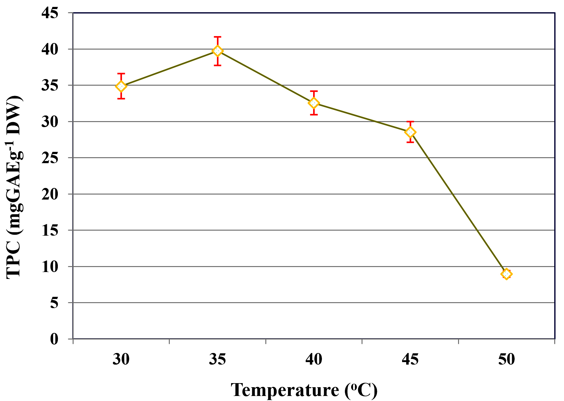 The influence of incubation temperature on TPC extraction during SmF of C. humicola MCH4 hydrolysate using B. subtilis was assessed across a temperature range of 30-50 °C (Figure 3). At 30 °C, the TPC yield was 34.88 ± 0.11 mg GAE g-1 DW. An increase in temperature to 35 °C resulted in a significant enhancement in phenolic content, reaching the maximum yield of 39.71 ± 0.21 mg GAE g-1 DW. However, further increases in temperature led to a progressive decline in TPC yield, with values of 32.56 ± 0.13 mg GAE g-1 DW at 40 °C and 28.55 ± 0.11 mg GAE g-1 DW at 45 °C. The lowest yield was recorded at 50 °C, with only 8.98 ± 0.09 mg GAE g-1 DW. This indicates that temperature significantly influence on extraction of TPC (p ≤ 0.05). The highest TPC was recorded at 35 °C, hence it was used as an optimal temperature for further study.