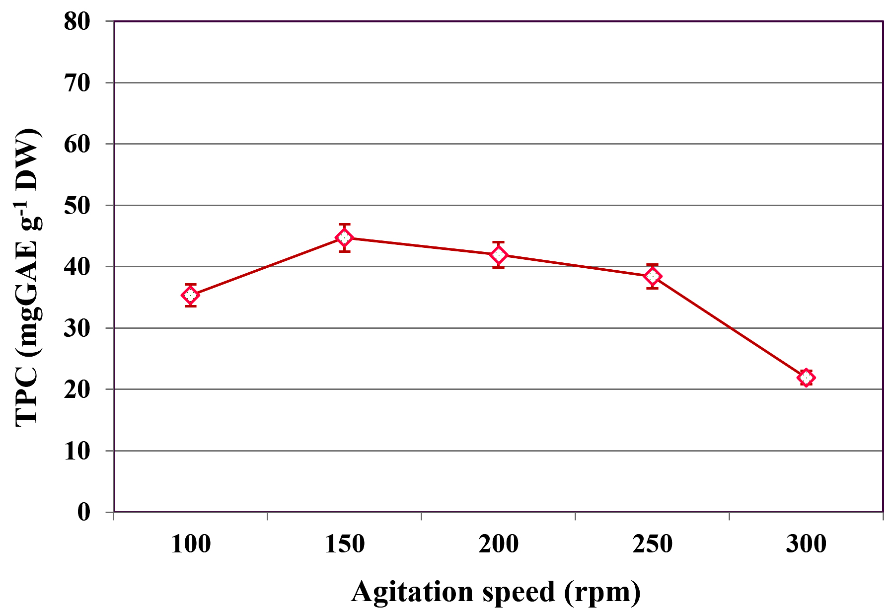 The impact of agitation speed on TPC extraction during SmF of C. humicola MCH4 hydrolysate using B. subtilis was assessed across a range of 100 to 300 rpm (Figure 4). At 100 rpm, the TPC yield was 35.33 ± 0.15 mg GAE g-1 DW. Increasing the agitation rate to 150 rpm significantly enhanced phenolic yield to a maximum of 44.72 ± 0.11 mg GAE g-1 DW. However, further increases in agitation speed led to a gradual decline in TPC content: 41.94 ± 0.10 mg GAE g-1 DW at 200 rpm, 38.41 ± 0.12 mg GAE g-1 DW at 250 rpm, and a pronounced reduction to 21.29 ± 0.21 mg GAE g-1 DW at 300 rpm. This suggests that agitation speed has a significant effect on extraction of TPC (p ≤ 0.05). The highest TPC was observed at 150 rpm, hence it was used as an optimum agitation speed for further study.