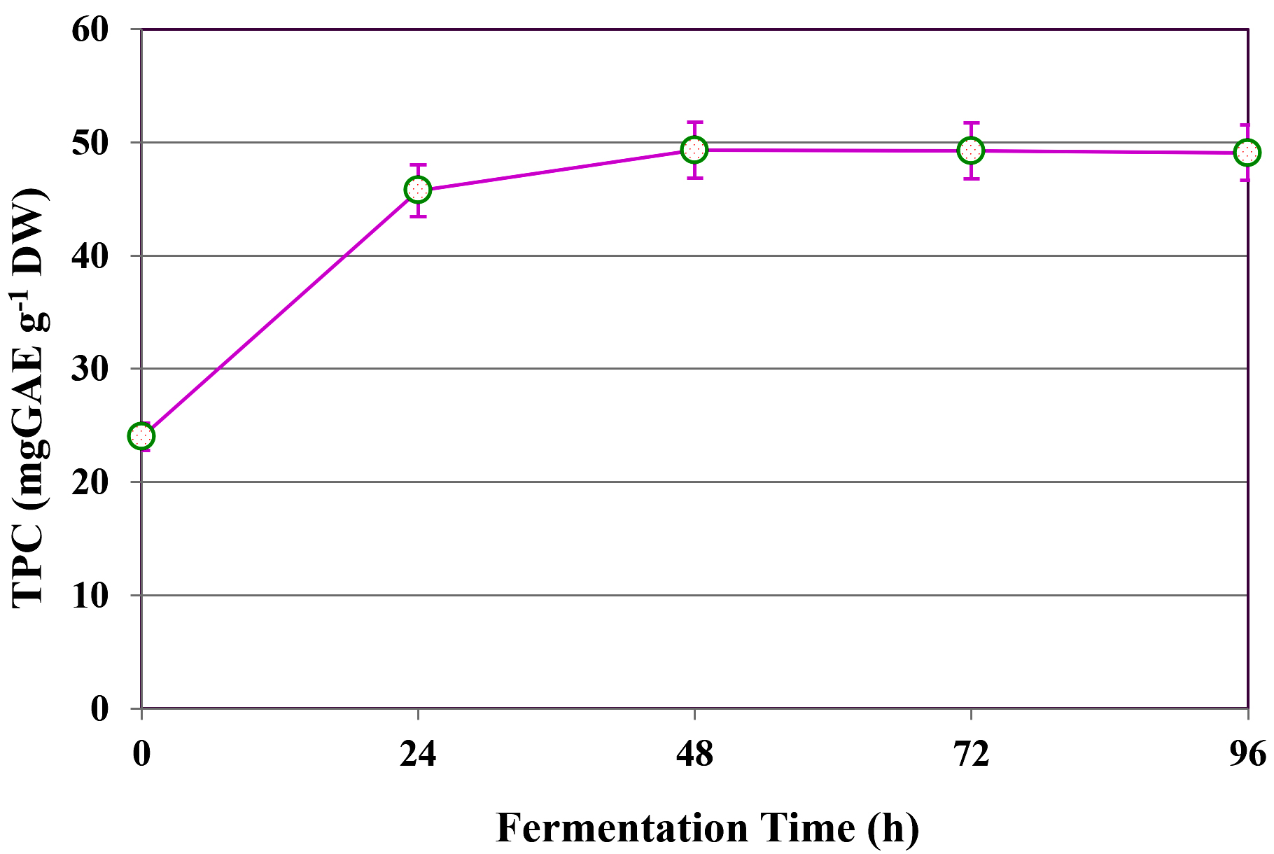 The influence of fermentation duration on the extraction of TPC from C. humicola MCH4 hydrolysate using B. subtilis was evaluated over a time range of 0 to 96 hours (Figure 5). At the initial time point (0 h), the TPC content was 24.00 ± 0.13 mg GAE g-1 DW, representing the baseline phenolic concentration in the absence of microbial fermentation. A substantial increase in TPC yield was observed after 24 h, reaching 45.75 ± 0.12 mg GAE g-1 DW. The highest phenolic yield was recorded at 48 h, with 49.34 ± 0.12 mg GAE g-1 DW. Beyond this point, the TPC levels remained relatively stable, with minor decreases observed at 72 h (49.26 ± 0.15 mg GAE g-1 DW) and 96 h (49.09 ± 0.11 mg GAE g-1 DW). The one-way ANOVA showed a statistically significant difference in TPC extraction with respect to fermentation time (p ≤ 0.05). TPC increased substantially from 0 to 48 h, after which it plateaued. This suggests that 48 h is likely the optimal fermentation time for maximizing TPC extraction under the conditions tested.