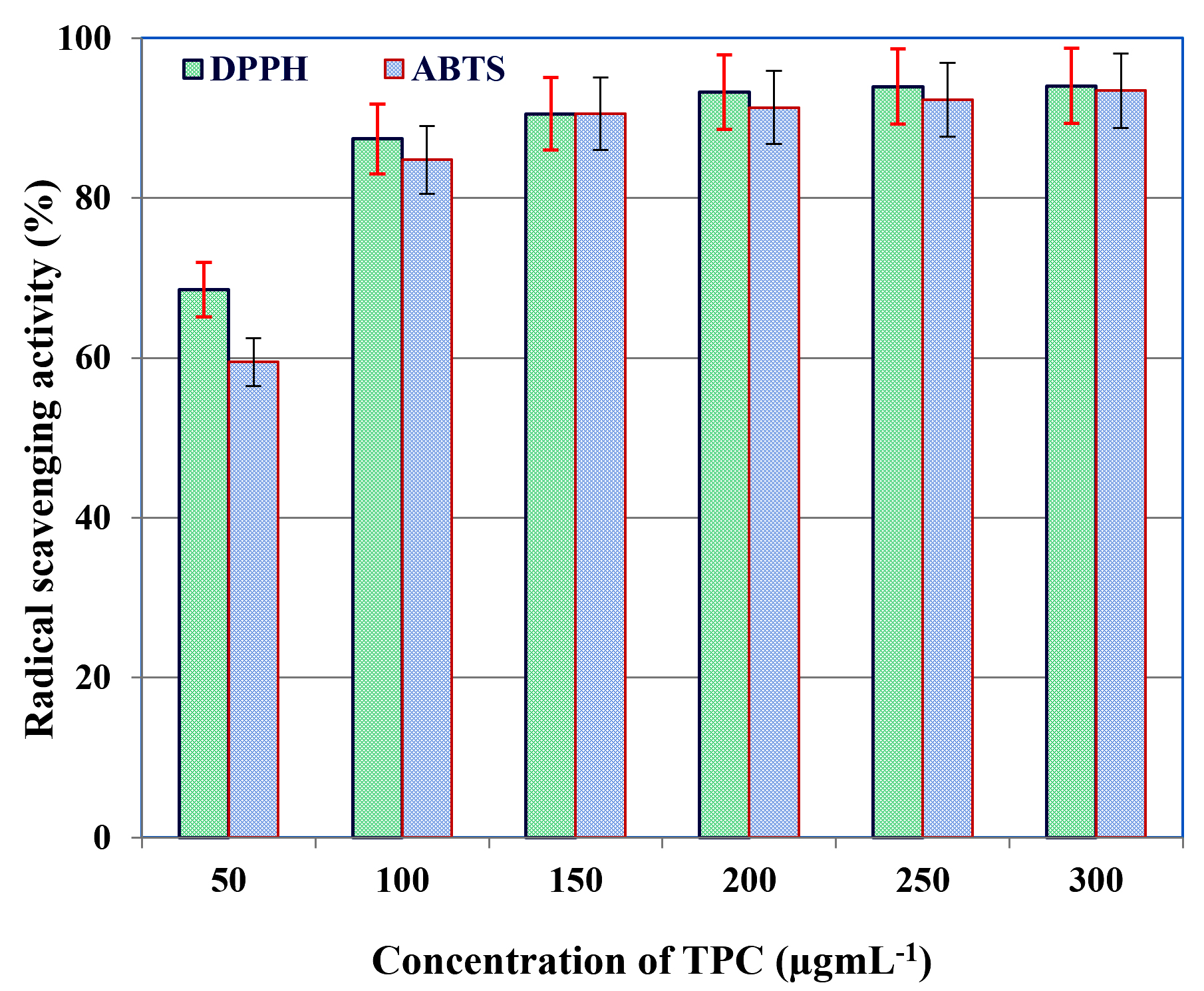 Antioxidant activity of TPC extracted from C. humicola MCH4 hydrolysate, fermented under optimized conditions with B. subtilis, was assessed using DPPH and ABTS radical scavenging assays. The results revealed a clear dose-dependent increase in antioxidant activity across a concentration range of 50-300 µgmL-1 (Figure 7). At 50 µgmL-1, the TPC extract exhibited a high DPPH radical scavenging activity of 90.08%, which gradually rose to 94.03% at 300 µgmL-1. This shows a strong positive correlation between TPC concentration and DPPH scavenging activity. The IC50 value calculated from the scavenging curve was 38.7 µgmL-1, indicating potent antioxidant potential.