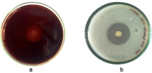 Figure 1. Isolation of amylase-producing and protease-producing bacteria. (a) Isolate that produces amylase enzyme; starch agar plate flooded with iodine solution. (b) Isolate that produces protease enzyme on skimmed milk agar after incubation period