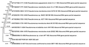 Molecular characterisation of LMSA and LMSPR was done by 16S rRNA sequencing method on BLAST analysis. The isolate identified as LMSA was Stutzerimonas xanthomarina (Figure 2) that showed 98% sequence similarity and the LMSPR as Pseudomonas pseudoalcaligenes (Figure 3) that showed 99.6% sequence similarity.