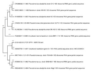 Molecular characterization of the selected bacterial isolates was carried out at Barcode Biosciences [Bengaluru, Karnataka]. Using the 16S rRNA sequence, BLAST analysis was done against the ‘nr’ database of the NCBI GenBank database. Based on the maximum identity score, ten sequences were selected and aligned using the multiple alignment software program CLUSTAL OMEGA, and the phylogenetic tree was constructed using MEGA IX software.28