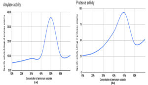 Partial purification of amylase and protease enzymes was performed with different concentrations of ammonium sulfate precipitation from 10% to 70% and the protein pellet from each saturation was collected and resuspended in PBS. Analysis of these collected fractions with the DNS method for amylase activity and the F-C method for protease activity showed maximum enzyme activity in the 50% ammonium sulphate saturation (Figure 4 and Table 3).
