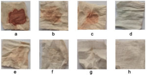 Figure 5. Visual observation of blood stained cotton cloth pieces treated with (a) water (50 ml), (b) commercial detergent (5 mg/ml), (c) amylase enzyme (3 ml), (d) mixture of amylase (3 ml) incorporated with commercial detergent (5 mg/ml), (e) protease enzyme (3 ml), (f) mixture of protease (3 ml) incorporated with commercial detergent (5 mg/ml), (g) mixture of amylase enzyme (3 ml) and protease enzyme (3 ml), (h) mixture of crude enzymes (6 ml) incorporated with commercial detergent (5 mg/ml)