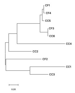 To obtain phylogenetic relationships, the 16S rRNA gene sequences of bacterial isolates from C. felis and C. canis were used to construct a phylogenetic tree. The phylogenetic construction produced two main monophyletic groups (Figure 4). Based on the phylogenetic tree formed, three bacterial isolates were in the same monophyletic group, namely CC2, CC1, and CC3. Thus, the three isolates have a close relationship. At the same time, the CC2 isolate is in its monophyletic group. CC4 is in the same group as CF1, CF4, CF3, and CC6, but not at the same node. This means that CC2 and CC4 have genetic variations compared to CF3, CC6, CC5, CF4 and CF1 (Figure 4). The results of this study indicate that bacterial isolates in both C. canis and C. felis have high species divergence.