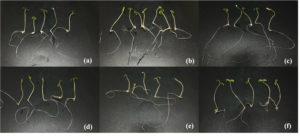 Figure 3. Efficacy of B. velezensis MSU01 powdered formulation on stem height and root length of tomato plants. (a) Talcum-based (b) Corn starch-based (c) Kaolin-based (d) Streptomycin (e) R. solanacearum (f) dH2O