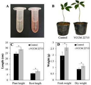 Figure 3. Effects of the VCCM 22715 on growth parameters of Panax vietnamensis plants. (A) IAA production by the VCCM 22715 in the ISP2 medium supplemented with 100 µg/mL tryptophan. (B) Representative images of ginseng plants inoculated with and without the VCCM 22715. Plant height, root weight (C) and fresh and dry weights (D) of ginseng in control group and VCCM 22715-treated group. The level *P < 0.05 was statistically considered significant using a Student’s unpaired two-tailed t-test by the GraphPad Prism 9 software