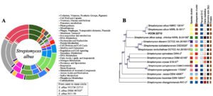 Figure 4. (A) RAST annotations of S. albus genomes and (B) Phylogenomic tree constructed for VCCM 22715 and the type strains of Streptomyces data set on TYGS. Tree inferred with FastME 2.1.6.1 from GBDP distances calculated from genome sequences