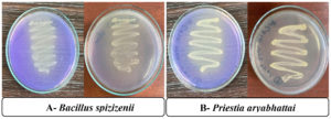 Figure 3. Morphological characteristics of cells and colonies of (A) Bacillus spizizenii and (B) Priestia aryabhattai