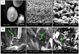 Figure 2. Scanning electron microscope (SEM) (A) no SOB attached to sulfur granules, (B) rod shaped SOB cells attached to sulfur granules