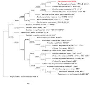 Figure 4. The first of 1000 equally most parsimonious trees obtained from a heuristic search (1000 replications) of Bacillus spizizenii strain B566 (in red color) compared to other closely similar 16S rRNA sequences in GenBank. Bootstrap support values for ML/MP are indicated above/below the respective nodes. Type strains are indicated with T. The tree is rooted to Heyndrickxia acidicola strain 105-2 as outgroup