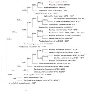 Figure 5. The first of 1000 equally most parsimonious trees obtained from a heuristic search (1000 replications) of Priestia aryabhattai strain B567 (in red color) compared to other closely similar 16S rRNA sequences in GenBank. Bootstrap support values for ML/MP are indicated above/below the respective nodes. Type strains are indicated with T. The tree is rooted to Heyndrickxia acidicola strain 105-2T as outgroup