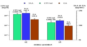 When Bacillus and Priestia were cultivated in nutrient broth supplemented with 0.1 g/L of tryptophan and incubated at 33 ± 2 °C for three days, the concentrations of IAA and GA produced by Bacillus recorded 141.9 µg/mL and 120.4 µg/mL, respectively, at a population density of 2.0 log CFU/ml in Figure 8.