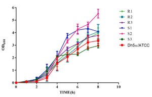 Figure 6. Growth kinetics of MDR (R1-3) and non-MDR (S1-3) EAEC isolates to bile salts (0.80%). Positive slopes (0.4984 to 0.6262 for MDR; 0.4936 to 0.6447 for non-MDR) indicate increased growth over time. Corresponding r² values (0.8939 to 0.9478 for MDR; 0.9059 to 0.9335 for non-MDR) reflect strong correlation between time and growth kinetics as determined by linear regression assay. Both MDR and non-MDR isolates demonstrate robust growth in the presence of bile salts, with MDR isolates showing slightly higher growth rates in this condition