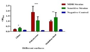 Figure 8. Biofilm formation on different surfaces by MDR and non-MDR EAEC isolates. Biofilm levels were assessed on polystyrene, glass, and stainless-steel surfaces by measuring optical density at 595 nm. MDR isolates showed significantly higher biofilm formation compared to non-MDR isolates across all surface types (p < 0.001). Error bars represent standard deviations