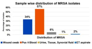 The majority of MRSA isolates were obtained from pus samples (57%), followed by wound swabs (34%), and to a lesser extent from blood (6%), ET aspirate (2%), urine, tissue, and synovial fluid (1% each). This highlights pus and wound swabs as the predominant sources of MRSA in this study (Figure 1).