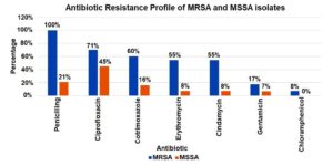 MRSA isolates demonstrated the highest resistance to penicillin (100%), followed by ciprofloxacin (71%), cotrimoxazole (60%), erythromycin (55%), and clindamycin (55%). Lower resistance rates were observed for gentamicin (17%) and chloramphenicol (8%). In comparison, MSSA isolates exhibited significantly lower resistance across all tested antibiotics, indicating a distinct difference in resistance patterns between MRSA and MSSA strains.
