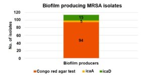 Another study showed, among the 68% of biofilm producing MRSA strains, 41% icaA and 31% icaB were detected, emphasizing the clinical problem faced by biofilm-forming, multidrug-resistant infections, which was statistically significant.21