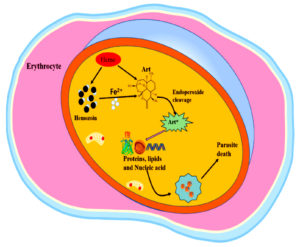 The mode of action of artemisinin against Plasmodium falciparum involves the destruction of proteins by carbon-centered radicals released upon activation of the drug. Artemisinin produces reactive oxygen species (ROS) when ferrous iron (Fe2+) is activated during hemoglobin digestion, as shown in Figure 2. This activation results in the development of alkylating agents that disrupt vital biomolecules, lipids, and proteins, damaging cellular roles and causing the death of parasites.42 This action radically differs from Other antimalarial medications, which usually target one enzyme or pathway.