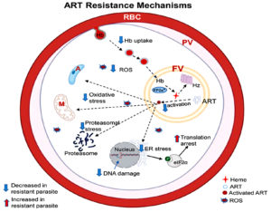 Recent studies proposed a direct interaction between Artemisinin and PfATPase6, a calcium ATPase essential for maintaining calcium homeostasis in Plasmodium falciparum.32 The binding of artemisinin to PfATPase6 causes notable structural changes that impair its role, resulting in elevated levels of calcium intracellularly and, ultimately, cell death.43 Emerging evidence shows that derivatives of Artemisinin could target Mitochondrial roles within the parasite, disrupting vital metabolic processes essential for survival, although this mechanism calls for more investigations.32