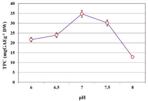The influence of different pH levels (6.0-8.0) on the extraction of TPC from C. humicola MCH4 hydrolysate, prepared using MAPT at 600 W and fermented by B. subtilis under SmF, was evaluated (Figure 2). TPC yield was lowest at pH 6.0, with a value of 21.65 ± 0.12 mg GAE g-1 DW. A gradual increase in TPC yield was observed with rising pH, reaching a maximum of 34.76 ± 0.22 mg GAE g-1 DW at pH 7.0. Further elevation of pH beyond this optimum resulted in decreased phenolic content: 30.15 ± 0.09 mg GAE g-1 DW at pH 7.5 and 12.82 ± 0.14 mg GAE g-1 DW at pH 8.0. The one-way ANOVA showed a statistically significant difference in TPC among the different pH levels (p ≤ 0.05). This indicates that pH has a significant effect on extraction of TPC. The highest TPC was observed at pH 7, hence it was used as an optimal pH for further study.