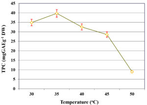The influence of incubation temperature on TPC extraction during SmF of C. humicola MCH4 hydrolysate using B. subtilis was assessed across a temperature range of 30-50 °C (Figure 3). At 30 °C, the TPC yield was 34.88 ± 0.11 mg GAE g-1 DW. An increase in temperature to 35 °C resulted in a significant enhancement in phenolic content, reaching the maximum yield of 39.71 ± 0.21 mg GAE g-1 DW. However, further increases in temperature led to a progressive decline in TPC yield, with values of 32.56 ± 0.13 mg GAE g-1 DW at 40 °C and 28.55 ± 0.11 mg GAE g-1 DW at 45 °C. The lowest yield was recorded at 50 °C, with only 8.98 ± 0.09 mg GAE g-1 DW. This indicates that temperature significantly influence on extraction of TPC (p ≤ 0.05). The highest TPC was recorded at 35 °C, hence it was used as an optimal temperature for further study.