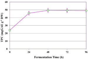 The influence of fermentation duration on the extraction of TPC from C. humicola MCH4 hydrolysate using B. subtilis was evaluated over a time range of 0 to 96 hours (Figure 5). At the initial time point (0 h), the TPC content was 24.00 ± 0.13 mg GAE g-1 DW, representing the baseline phenolic concentration in the absence of microbial fermentation. A substantial increase in TPC yield was observed after 24 h, reaching 45.75 ± 0.12 mg GAE g-1 DW. The highest phenolic yield was recorded at 48 h, with 49.34 ± 0.12 mg GAE g-1 DW. Beyond this point, the TPC levels remained relatively stable, with minor decreases observed at 72 h (49.26 ± 0.15 mg GAE g-1 DW) and 96 h (49.09 ± 0.11 mg GAE g-1 DW). The one-way ANOVA showed a statistically significant difference in TPC extraction with respect to fermentation time (p ≤ 0.05). TPC increased substantially from 0 to 48 h, after which it plateaued. This suggests that 48 h is likely the optimal fermentation time for maximizing TPC extraction under the conditions tested.