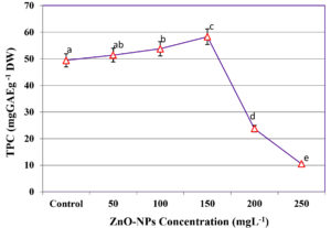 SmF medium amended with different concentrations of ZnO-NPs ranging from 50 to 250 mgL-1 with an increment of 50 mgL-1. Each flask was inoculated with 5% (v/v) of a freshly prepared B. subtilis culture and incubated under previously optimized fermentation conditions using an orbital shaking incubator. A parallel control experiment without ZnO-NPs supplementation was also included. End of SmF, TPC was quantified, and the nanoparticle concentration yielding the highest TPC was determined and selected for subsequent studies.